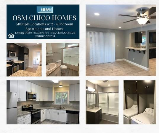 Building amenities: Newly Remodeled, Garbage Disposals, Close to CSUChico and Public Transportation , Upgraded Flooring, Fully Equipped Kitchens, Centrally Located, On Bike Path To CSU Chico, Off Street Parking, Professionally Managed, Pet Friendly- Ask for details, After Hour Emergency Call Service, Landscaping Fee, Central Heating & Air or Mini Split System