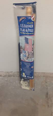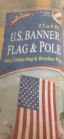 Brand new in the bag U.S. Banner flag and Pole. Flag is 2 1/2 ft x 4 ft comes with wooden Pole and all the hardware to hang outside your home this flag was made in the USA. Flag Day is coming June...