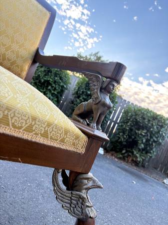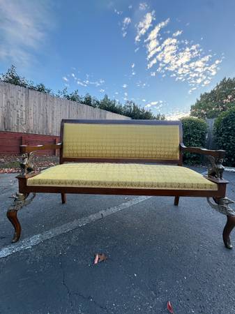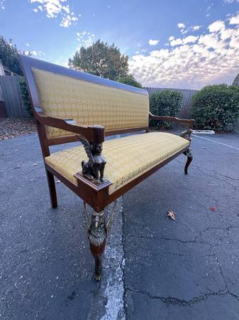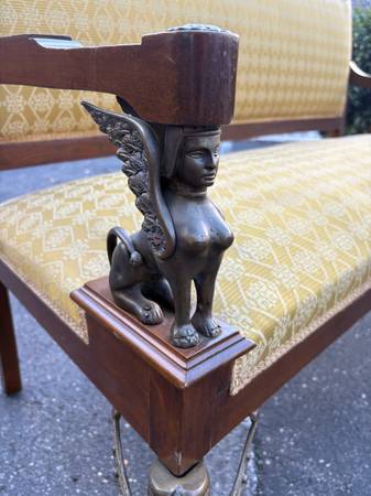 This is the real deal. Absolutely breathtaking original settee. Kept in perfect shape. Unbelievable how perfect it really is. Features a sphinx under the armrests, and a gryphon on each front leg. Very nice, very unique. Mahogany. I have only seen one other like this one, and it was a really terribly made replica. The details show its amazing quality. This will be in your family for many generations if kept clean.