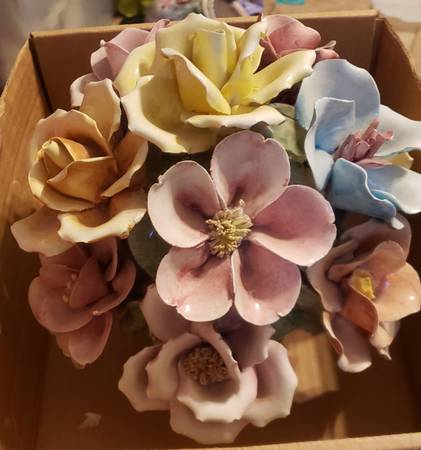 Multiple hand-crafted porcelain flowers (roses, possibly orchids, other blooms)