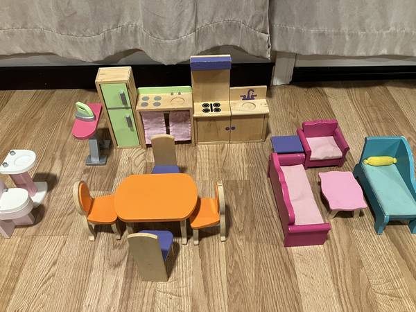 10 Only Hearts Club dolls (12-inch posable fabric dolls, only face and hands are plastic) in various outfits with some extra outfits (mermaid tails, scarf, skirt, non-original yellow skirt and tip, and pjs). The dolls come with 4 animals (unicorns and dogs) and 18 pieces of wood-furniture that fit the 12-inch doll size. The furniture is not Only Hearts Club but was bought for the doll set. The furniture pieces are in good working order but have nicks here and there. The toilet (see last picture) needs a lid repair. 6 of the dolls have the original length hair, but 4 dolls got a hair-cut (well done though ;)).