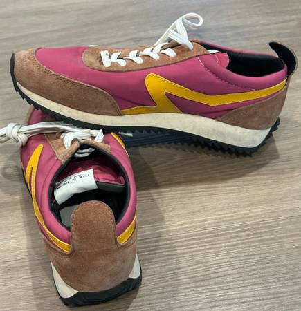 Very good pre-owned condition. In pink and yellow with suede and recycled polyester uppers and cow leather trim. Lace-ups with round toe silhouette. Leather lining and insole with rubber outsole. Size 37.5 is equal to size 7.5 US Women’s.