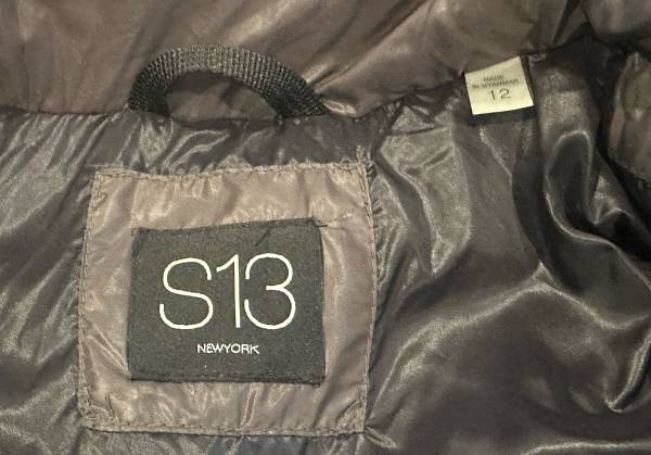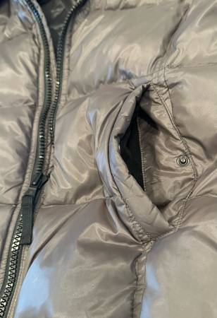 Excellent condition. No signs of wear. Features a detachable hood, full front zip up, lined, insulated with duck down and feathers, thumb holes in fabric at wrists. Color is gray.