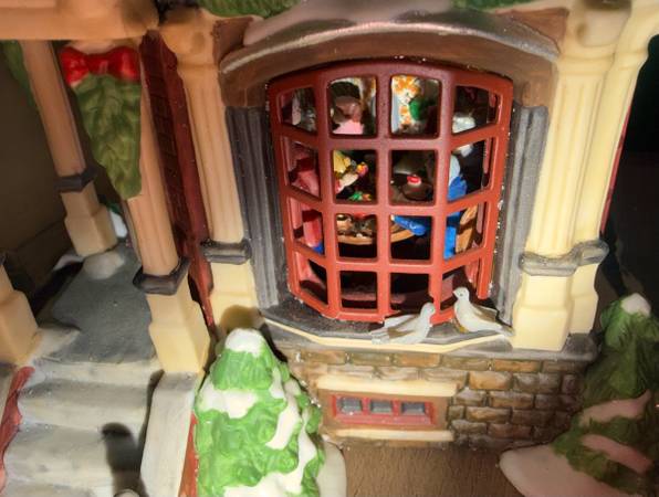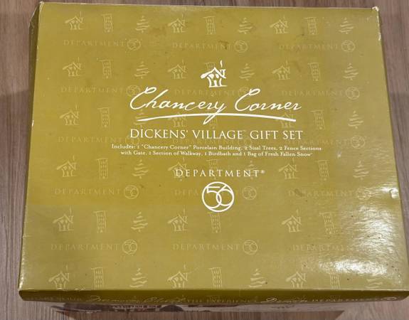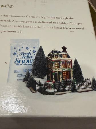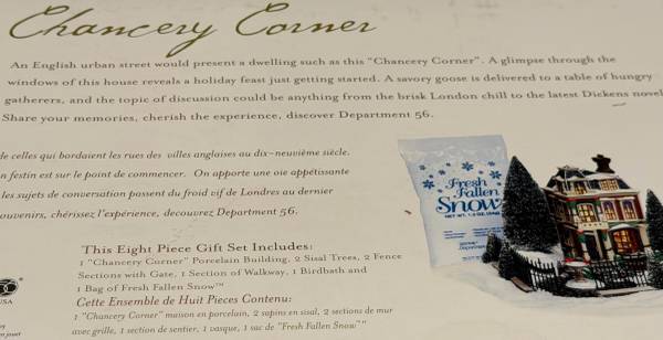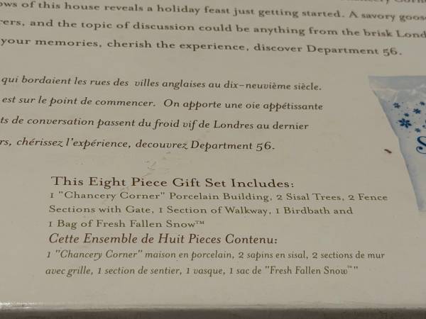 Includes 1 Chancery Corner Porcelain building, 3 fence sections with gate, 1 birdbath and 1 unopened bag of fresh fallen snow. Does not include light or sisal trees. Christmas decor