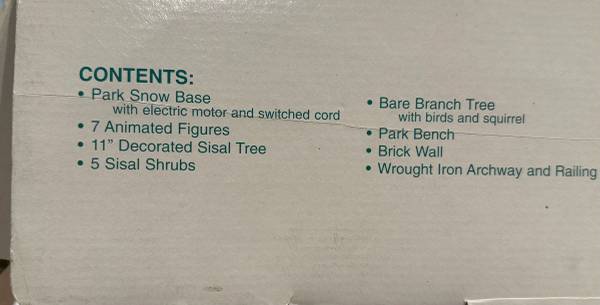 This medium sized, round shaped Christmas village accessories set features animated figures. It was manufactured in 1995. Style is traditional and includes porcelain and plastic pieces depicting various characters and scenes from the animated Christmas village collection. Perfect for adults and collectors, this original set brings a festive and whimsical touch to holiday decor.