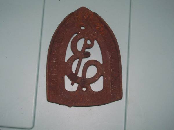 Vintage Sad Flat Cast Iron Trivet. Made by Enterprise MFG. Co. Phila, U.S.A. Asking $25.00 for it.