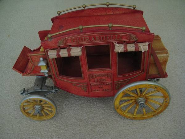 9”t x 13”w. X 7”d. Crackled red/gold On Stage: “D. Garardelli & Son Chocolate Co. Est. 1852” wood /fabric/leather straps trunk on rear of coach CASH ONLY. Near Paradise, California.