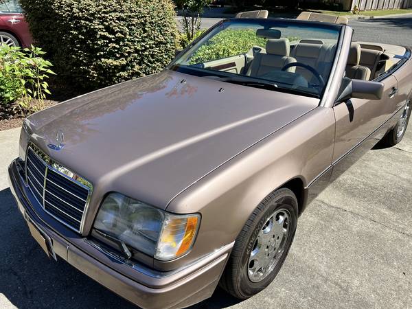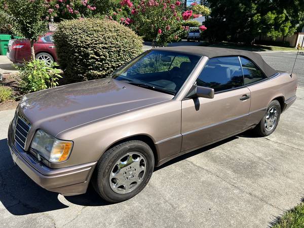 1994 Mercedes E320 123K miles, rare champagne color with brown soft top, runs and drives great. Everything works (except front seat automatic headrest), all hydraulic cylinders in the convertible top recently replaced, top goes up and down with ease. Aftermarket stereo installed with bluetooth, touchscreen, hands free calling with apple car play/android auto, original stereo also included. Tires have less than 1000 miles and are less then five years old. All manuals, wind deflector, original trunk mounted cd player, and cover included. Just passed smog. Ready to sell.