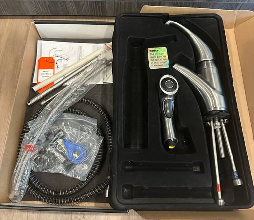 Overstock item. Retail price is $351. Includes original packaging and accessories pictured. 100% solid scratch-resistant commercial grade stainless steel. Features a single-lever control for water and temperature and a pull-out dual-spray head. 1 3/8” single hole installation.