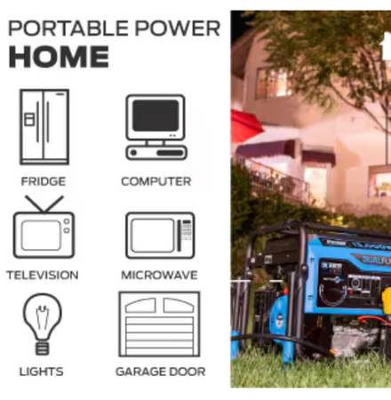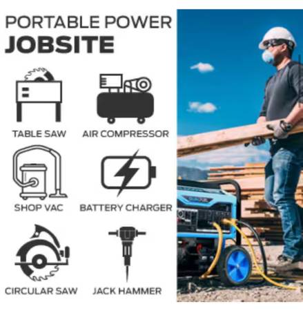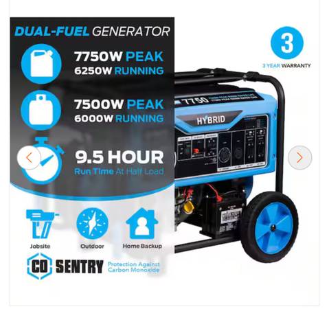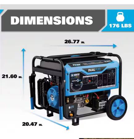 Large 6.6 Gal. fuel tank give you up to 9.5-hours of continuous operation at half load when running on gasoline