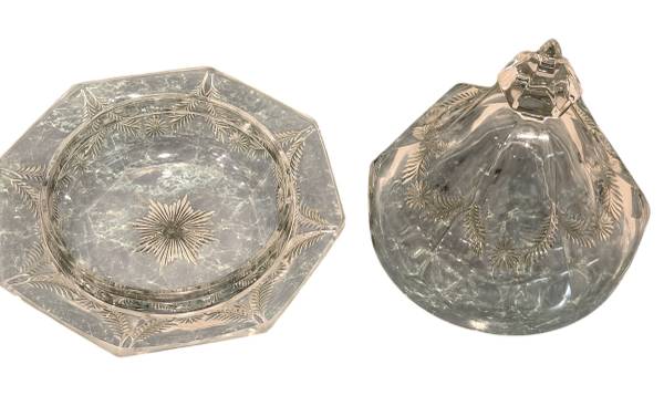 2-piece set with a domed lid and a base. The lid and base are made of clear, pressed glass and feature a decorative pattern. This dish can be used for serving butter, cheese or candy. The dish is 6.5” D. The opening for the butter or other food item is 4.”D.