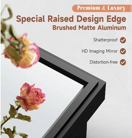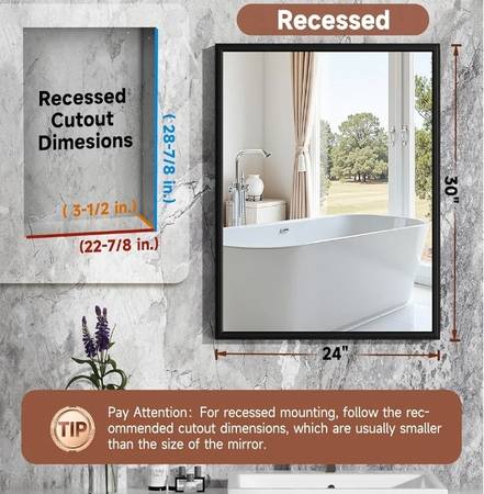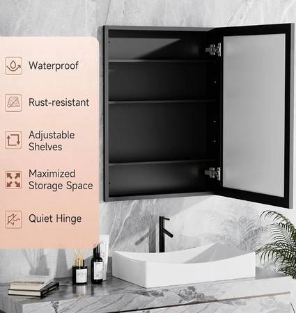 NEW IN BOX RUST-PROOF BLACK ALLUMINUM MEDICINE CABINET CAN BE INSTALLED FLUSH-MOUNT OR RECESSED FOR STORAGE AND HIGH-DEF MIRROR. INSTALL OVER SINK OR AS SECONDARY FOR MULTIPLE ANGLED DRESSING MORROR...