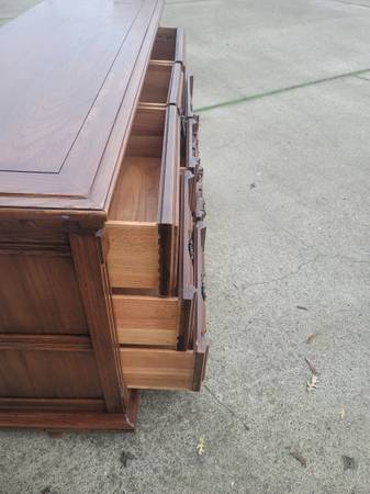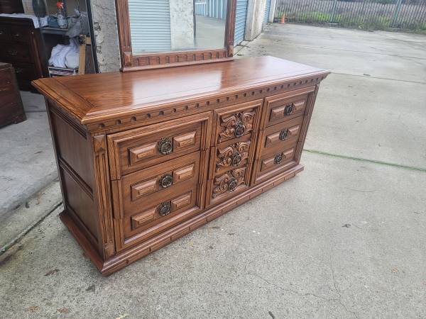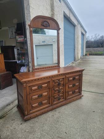 Solid and beautiful, all the dovetailed drawers slide perfect. 66" long 33" tall 20" deep, the mirror adds an additional 49" in height Curbside drop off in Chico is $30 extra Kim 53o…355…9oo7 Jen...