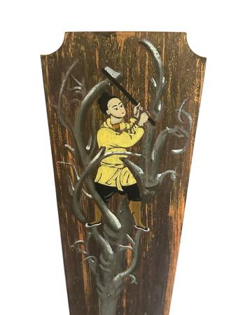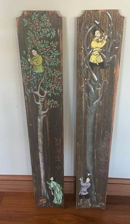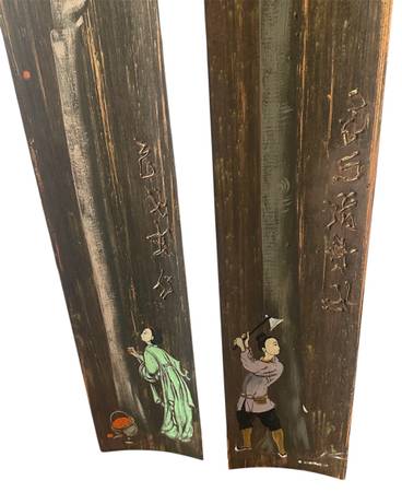 These panels are of East Asian influence, possibly Japanese or Chinese. They each measure 38” L x 1/4” W x 6 1/4” W. Easy to hang on a wall with attached hooks.