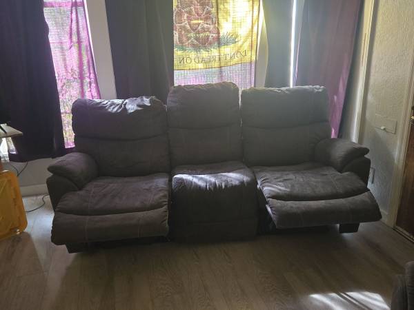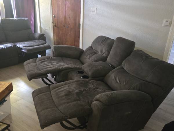 No stains ,rips great condition will sell separately 125 sofa 175 double electric recliner color bluish gray