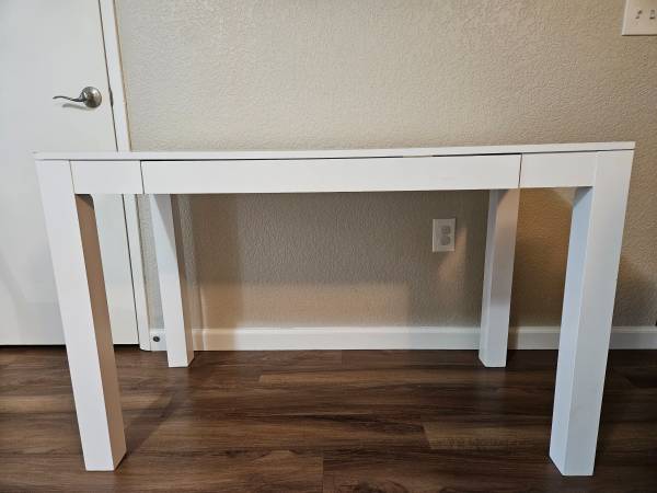 White desk with one drawer. Minor wear. Chipboard but sturdy. Dimensions: 47.5"L x 23.5"D x 30"H