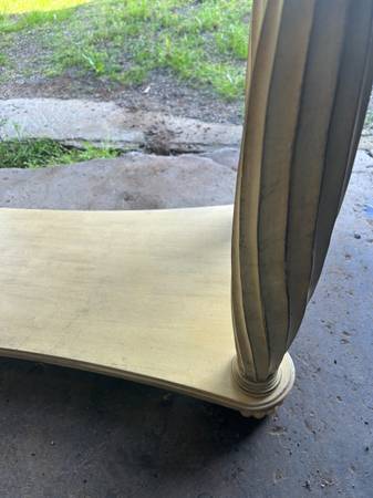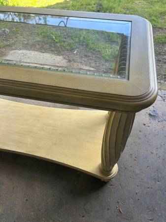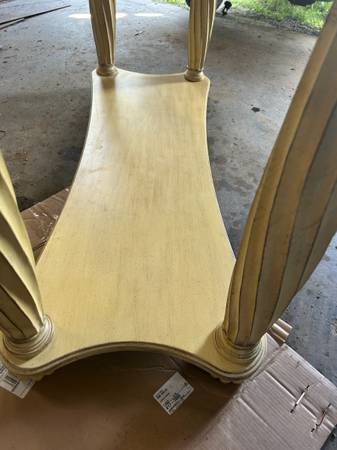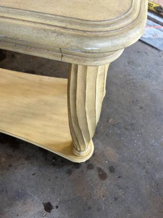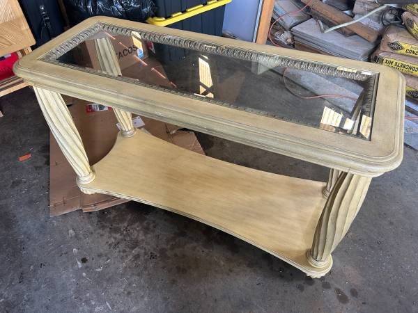 Heay wooden sofa/console table with lass insert. Glass is intact. Finish is a creamy distressed color Smoke free home Measures 20" x 49" long and 30" tall Good used condition. $65.00