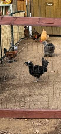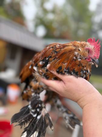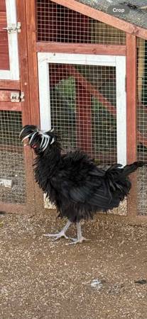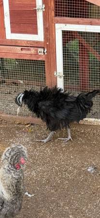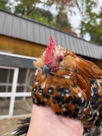Free roosters Polish frizzled is 4 or 5 months Polish has been picked on so top of head has feathers plucked out. No open sore although I have been putting ointment on it preventative Mille Fleur...