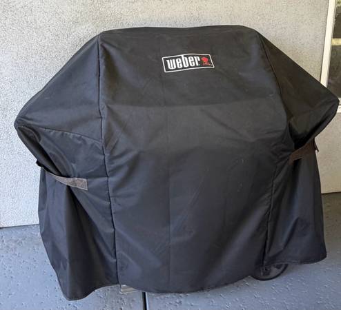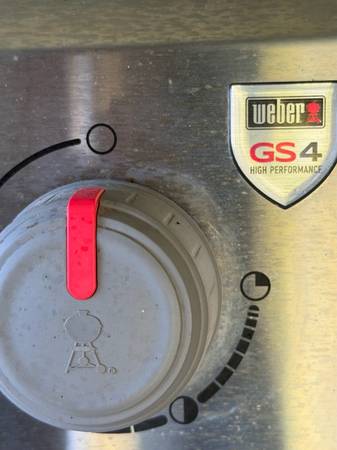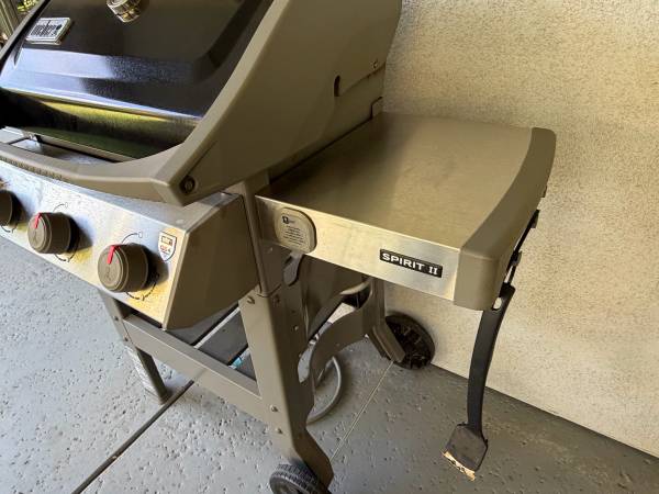 Excellent pre-owned condition. Features a built-in open carry design where you can keep your tools & equipment within reach. Porcelain enameled lid retains heat and protects your grill from the elements. The lid has an integrated thermometer to make it easy to know the grilling temperature. This bbq has a fold-down left hand stainless steel side table, 6 hooks for hanging your grilling tools, electronic push button ignition system (uses 1 AA battery). Primary cooking area is 424 sq. in. Total cooking area is 529 sq. in. It is connected to the gas line coming from the house but can also be attached to a propane tank.