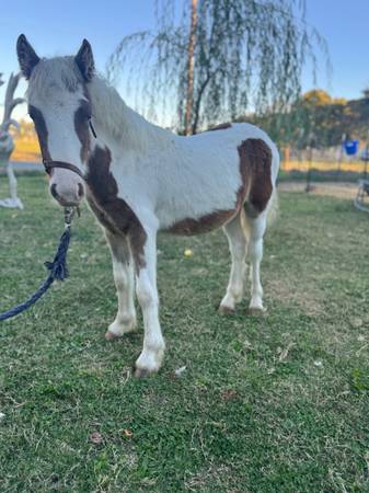 Beautiful sorrel tobiano filly one blue eye. Mom is Shetland cross at 10.1 hands and dad is Mini Gypsy 11.2 hands. 7 months old in the process of weaning currently.
