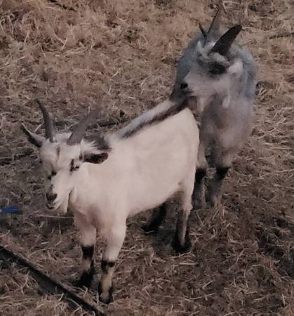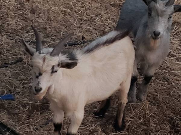 ONLY 3 Dwarf Nigerian dairy goat WETHERS LEFT! 2 adorable whites with cute black markings and a lovely grey silver boy. They all have a very calm personalities and get along great together and with other goats. A very good gentle group of boys. ππ₯° Around 6 months old.