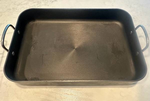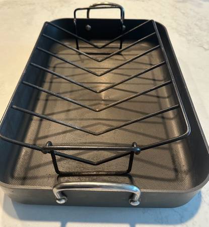 This roasting rack is in very good pre-owned condition. Includes a removable rack for elevating food above drippings and has a non stick coating for easy release and cleanup. Size is 12” x 18”....