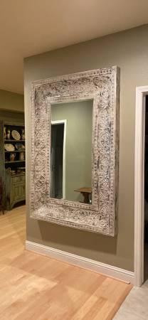 Large unusual decorated tin Wall beveled Mirror. Can be hung high or low on a wall. Very good condition. 48 x 72”. Depending on where it’s hung it takes on different colors. Also can stand on the...