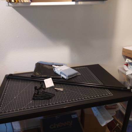 Racka Curtain Rod Set, originally $48 total, asking $35, includes all parts and one brand new black out curtain (in blue). Second curtain used with kitty pin pricks free, no other damage.