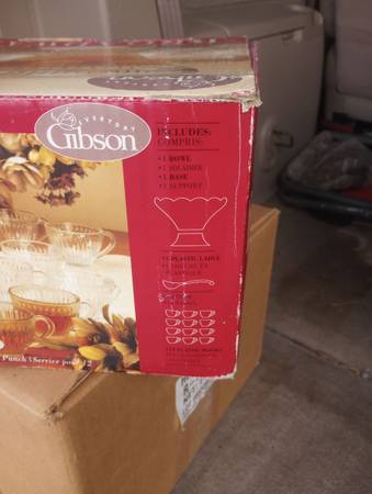 Brand new set includes Punch Bowl, Punch Bowl base for Punch Bowl to set in, a Punch Bowl ladle and 12 Punch Bowl cups with hooks to hang cups on Punch Bowl.