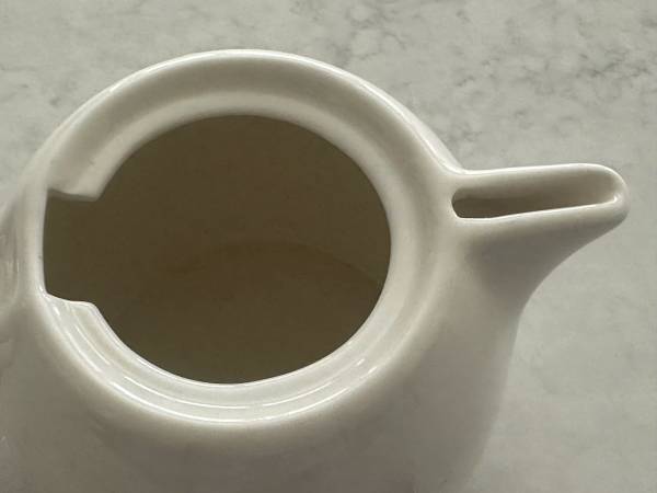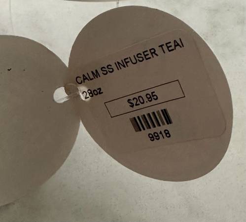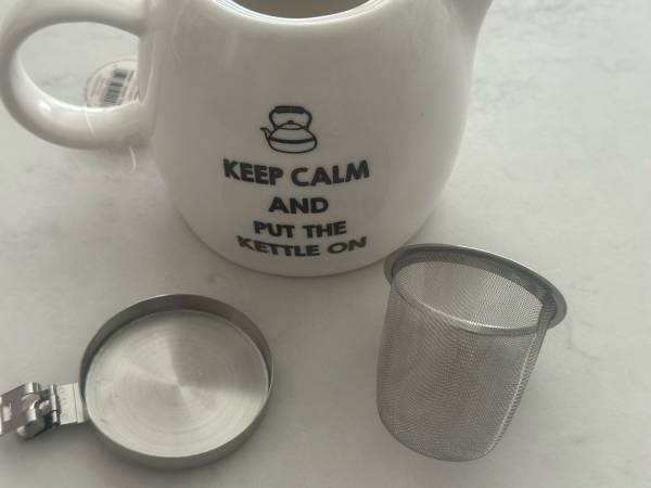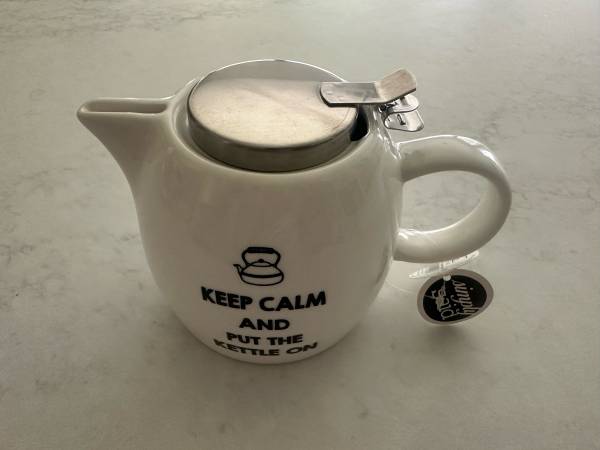 Never used, tag still attached. Includes metal lid and infuser. The phrase “KEEP CALM AND PUT THE KETTLE ON” is imprinted on both sides. Microwave and dishwasher safe.