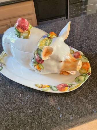 Cute Ceramic pig soup tureen and platter. Tureen measures 18”x7”. Platter 19”x12”