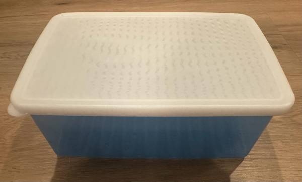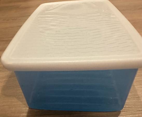 Very good pre-owned condition. 8” L x 5 1/4” W x 3 1/8” D. Rectangle shape, holds fruits or vegetables. It has vents on one side and a waffle shape on the bottom to keep moisture away from food. Includes white lid which seals tight. Brand is Tupperware.