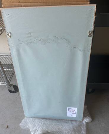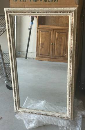 Very good pre-owned condition. The wood frame is crème colored with decorative elements. It has a vintage style. It comes with mounting hardware or can be used as a floor mirror. It measures 19.5”W x 33.5”H. No cracks in the glass.
