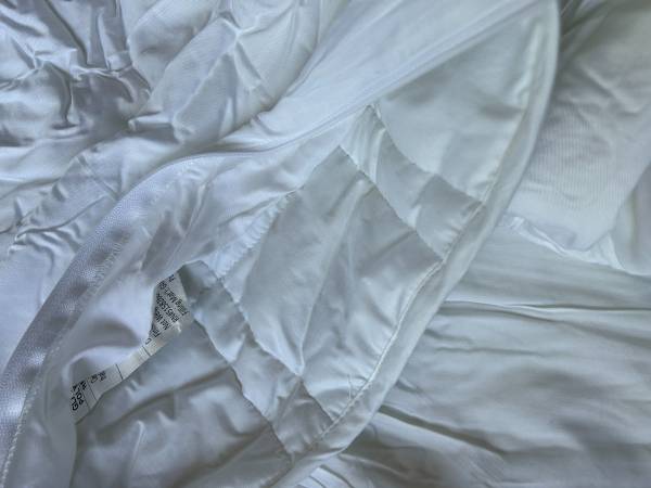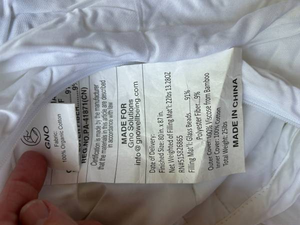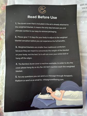 Nearly new white 25 lb weighted blanket. Comes with washable, zippered organic cotton duvet cover and large storage bag. Smoke free home. Less than half price of the original $50