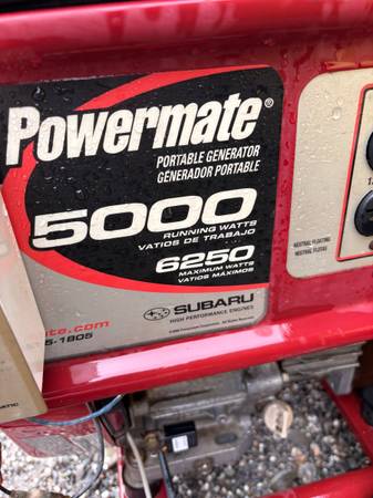 Generator -Subaru engine with power mate generator. 6200 watts peak 5000 continuous watts with wheels and handle 530-520-seven 5 99