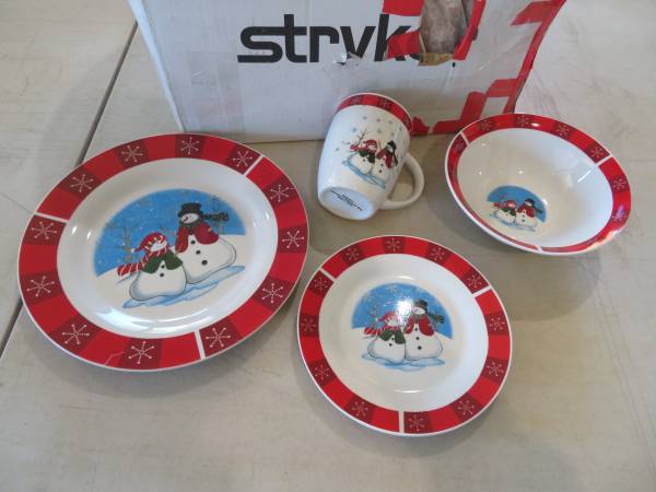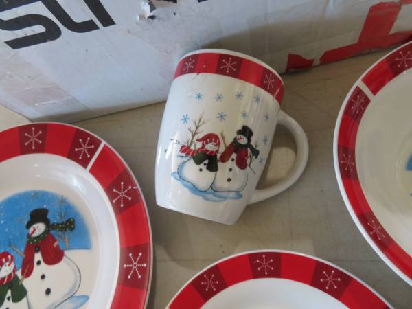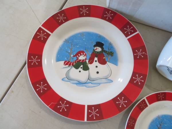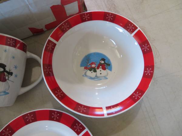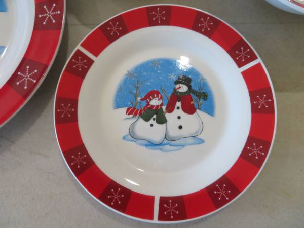 Christmas snowman-themed dinnerware set including plates, bowls, and mugs. Set is incomplete. Includes 8 dinner plates, 8 small plates, 4 bowls & 4 mugs. Cash only. Sorry no checks.