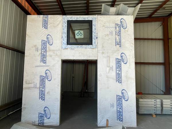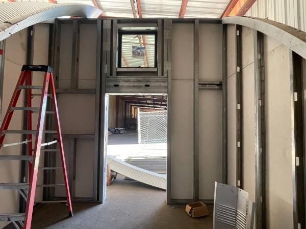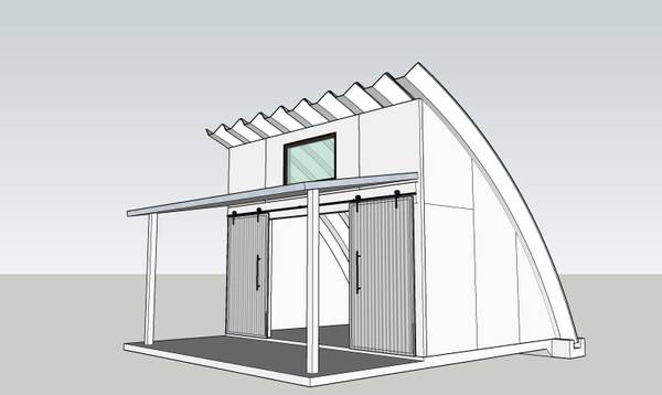 Fully Built Shed. Retail price was $20,000. Dimensions 12 x 12 x 12 ft. Finished model included for reference, does not include the awning or sliding metal door. Steel stud frame with fire resistant exterior paneling and curved Quonset roof. Will be deconstructed and delivered on purchase. Price is slightly negotiable, serious buyers only. Contact for more details.