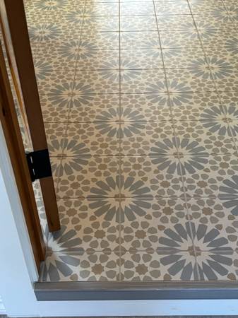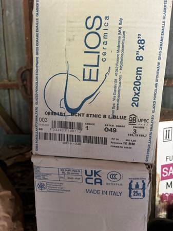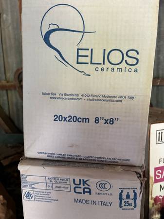 Decorative tiles; made in Italy; glazed porcelain stoneware; 8 x 8 squares; 1 and 2/3 boxes, approximately 50 tiles; pale blue and tan on white.