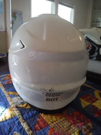 GOOD SHAPE SHOEI HELMET, USED BUT NOT ABUSED. LINING IN GOOD SHAPE AND OF COURSE IS WASHED AND CLEAN. SIZE LARGE FITS LIKE A LARGE. NEW IS OVER 500.00 FOR A BASIC NO GRAPHICS MODEL OF A VFX SHOEI.
