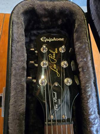 Beautiful Les Paul 100 sunburst Epiphone electric guitar. With original matching hard shell Epiphone case. The Epiphone case is a really nice low other covered hard shell in excellent working condition. This setup would cost you $400 brand new. I'm selling them for almost half price at $250.