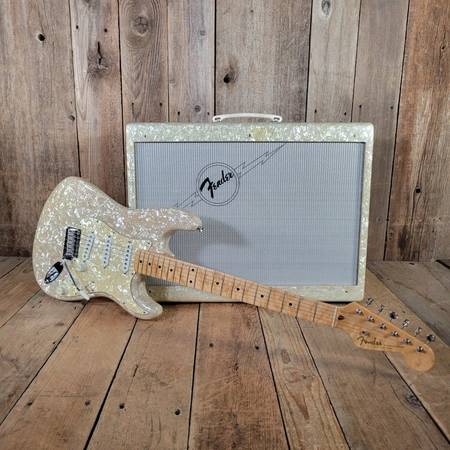 This 1996 Fender Custom Shop MOTO Set pair a stunning Stratocaster with a matching Blues Deluxe amplifier—both finished in Mother of Toilet Seat (MOTO) pearloid, making it one of the most visually striking and collectible Fender sets ever produced. Released in extremely limited numbers to commemorate Fender’s 50th anniversary, this set showcases the Custom Shop’s artistry and attention to detail.