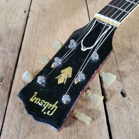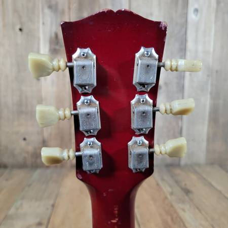 The electronics are completely original with untouched solders. All the hardware and parts are original. Grover tuning machines were once installed, and better work could have been done. Two spots on the holly headstock veneer show chip out from the drilling of the tuner post holes. Original Kluson Deluxe tuning machines are now installed.