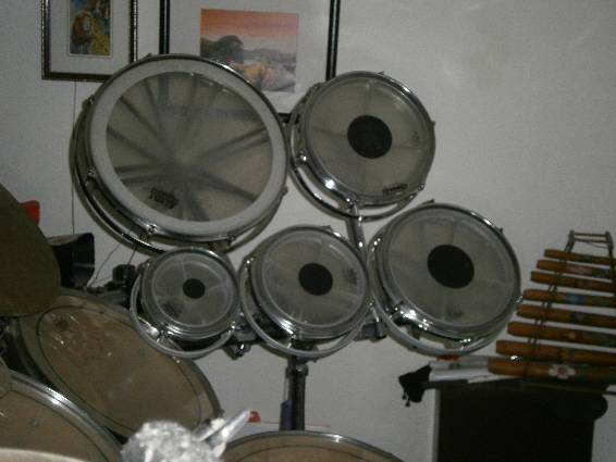 Everything you will need to dazzle your audience. For your inspection, I'm offering an eight piece ensemble, including two bass drums, four tom toms (mounted on heavy duty Gibraltar racks) a floor tom, a snare, a high-hat, three cymbals (Paiste); also, cowbell, a block, and wind chimes. Multiple sticks. And of course there is the throne so you're not forced to stand up while you're playing (: