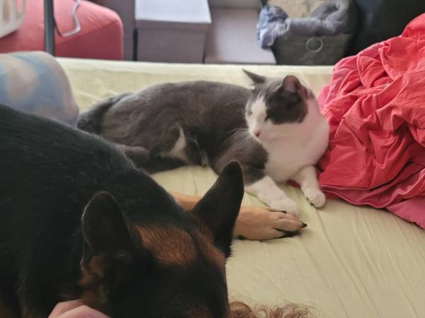 Right now he's staying with someone who has senior cats & his energy is just a bit too much for them. He'd thrive in a home w/ other active pets or as the only cat in a dog-friendly household.