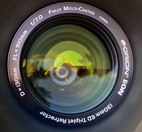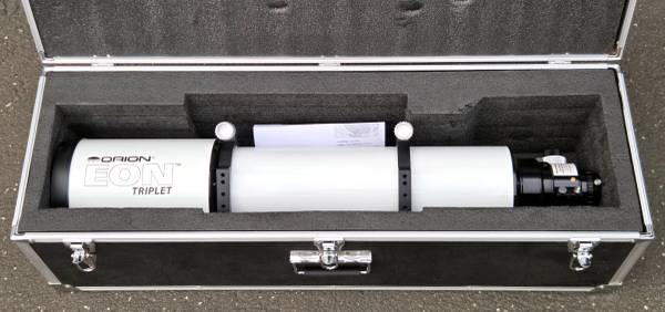Very clean and well performing Orion EON 130ED triplet astronomy telescope with Synta style finderscope shoe, rings, Vixen dovetail and original hard case as shown. 130mm (5.1”) objective, 910mm focal length, f7.