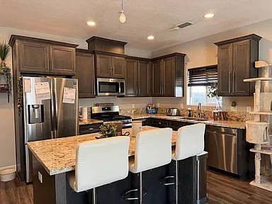 The open-concept design features a bright kitchen with a spacious island, granite countertops, and modern cabinetry. The living area has durable waterproof laminate flooring, while bedrooms include soft carpeting for comfort.