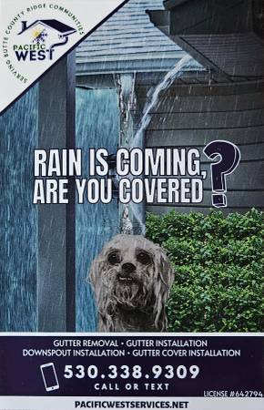 Text email or call. Bobby Quinn doing business as Pacific West, with over 40 years of experience license in good standing since 1991. I will deliver fabricate and install OG gutter in white or brown finished inside and out as low as $6.90 a foot on a typical single level home with the purchase of leaf and debris guard. Downspouts are $60 each. Custom colors are available at an additional charge. Leaf and debris guard also available as low as $6.00 per foot. Leaf and debris guard is fabricated from aluminum with a factory finish. It attaches to the leading edge of the gutter and tucks underneath the existing roof for a permanent solution stopping leaves pine needles and other debris from clogging your gutters and downspouts.