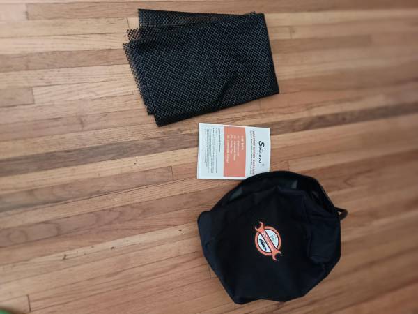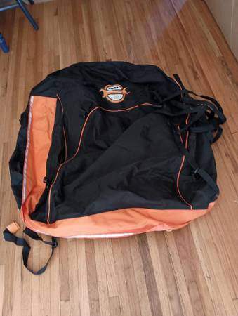 The first picture shows the bag itself (it is about 4 ft long, and 3.5 ft wide, although it looks smaller in the picture.) The second picture shows a pad (to protect the paint on your roof against abrasion--mine was not scratched at all from the trip), a bag that held this pad and the straps (which are all attached now) and an instruction card.