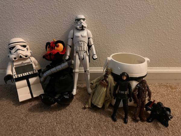 5 Star Wars action figures and a stormtrooper alarm clock and stormtrooper Halloween basket and a Disney Star Wars plushie 20$ for all of them