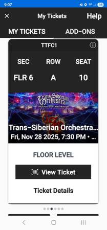 Two tickets for the show at Golden One Center Friday the 28th at 7:30. The tickets are on the floor row A seats 10 and 11.